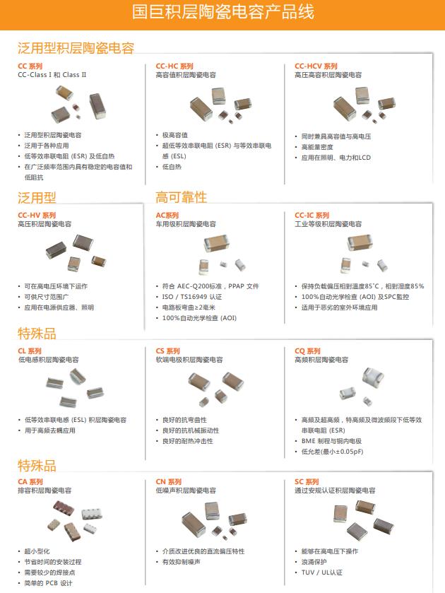 YAGEO國(guó)巨多層陶瓷電容器主要包括:普通陶瓷電容器,高值陶瓷電容器,串聯(lián)電容器,高壓電容器,中壓電容器,高頻電容器,微波電容器,低電感電容器,X2Y®電容器濾波器,陶瓷層電涌保護(hù)器等。