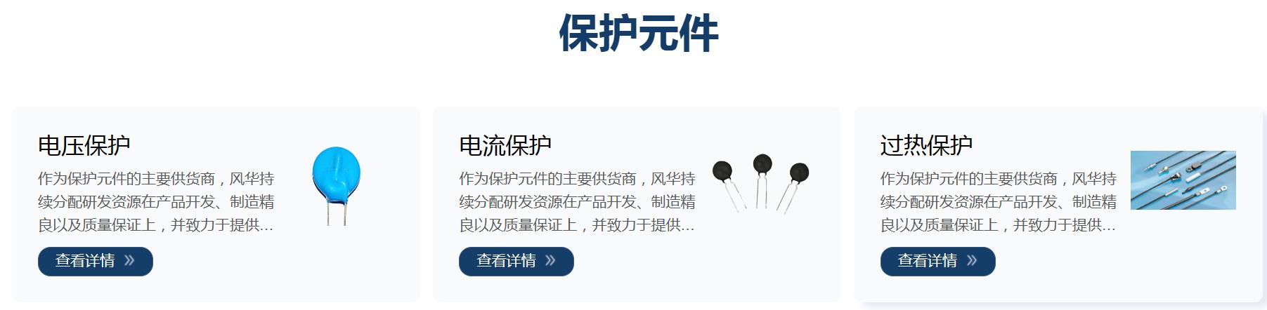 風(fēng)華保護(hù)元器件種類有:電壓保護(hù)、電流保護(hù)、過熱保護(hù)及其他產(chǎn)品。