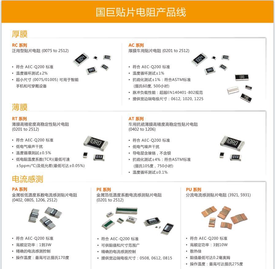國巨貼片電阻:車用貼片電阻,電流感測微歐姆電阻,抗硫化貼片電阻,薄膜精密電阻,厚膜精密電阻,一般厚膜電阻,排阻與網(wǎng)絡(luò)排阻,高壓電阻