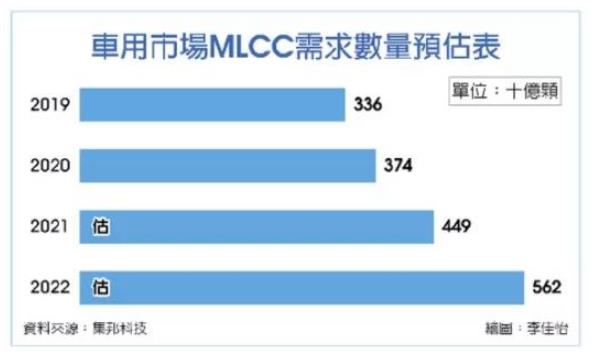 盡管消費性產(chǎn)品需求轉(zhuǎn)弱,但自第三季起至今,汽車市場維持強勁的需求,成為供應(yīng)商在新產(chǎn)品規(guī)劃與產(chǎn)能擴增的重點方向。預(yù)估2021、2022年車用MLCC需求將上看4,490億顆、5,620億顆,年增率將達20%、25%。