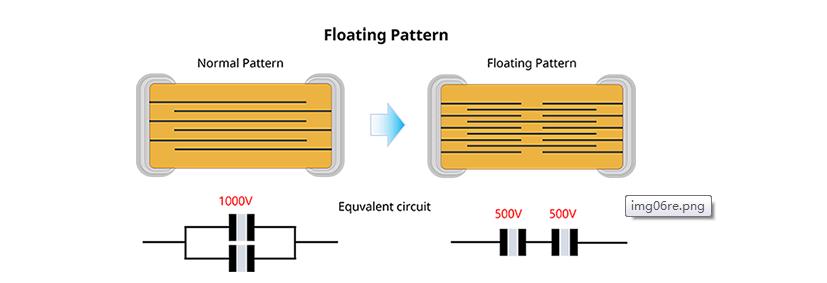 Floating設(shè)計雖然是在MLCC 發(fā)生Crack時,能夠降低短路風(fēng)險的結(jié)構(gòu),但是在高電壓下也是非常有用的結(jié)構(gòu)。Floating 結(jié)構(gòu)在MLCC內(nèi)部將電壓按一半分配。例如在MLCC兩端施加1000V電壓時,利用Floating設(shè)計可將MLCC電介質(zhì)內(nèi)部的電壓降低到1000V的一半,也就是500V。因為MLCC的壽命由溫度和電壓決定,而施加在MLCC電介質(zhì)上的Electric field變?nèi)?,所以在可靠性方面便有了?yōu)勢。
