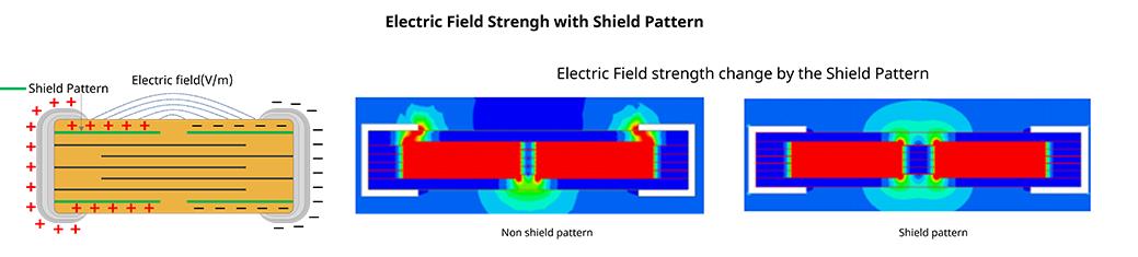 高壓MLCC結(jié)構(gòu)與一般MLCC 相比有何不同呢?在高電壓環(huán)境下需要確??煽啃?。暴露在高壓環(huán)境下的MLCC有Arc-ove的危險,MLCC內(nèi)部存在短路的危險。當(dāng)向MLCC施加高電壓時,MLCC周圍會形成強電場(Electric field),進(jìn)而產(chǎn)生ionized air。尤其是在MLCC端電極部位集中了大的電場(Electric field)。如果在Ionized air中超過了啟動電壓(inception voltage)就會發(fā)生電 Arc,MLCC 內(nèi)部就會有發(fā)生circuit short 的危險。防止這種現(xiàn)象產(chǎn)生的結(jié)構(gòu)是shield pattern。