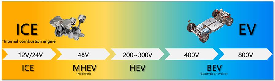 汽車電池的電壓上升與汽車的電氣化有關(guān)。汽車電池的電壓是如何變化的呢?在二十世紀(jì)五十年代中期之前汽車電壓為6V。隨著汽車發(fā)動機(jī)容量的增大,需要大功率的Starter Motor,之后增加的電裝設(shè)備使電池電壓標(biāo)準(zhǔn)變?yōu)?2V。初創(chuàng)期的汽車需要的電壓很小,僅用于帶動Crank及收音機(jī)。但隨著汽車安全設(shè)備的增加、便利配置的改善等,隨著時間的推移,增加的電子設(shè)備越來越多。由于所需的電力也隨之增加,關(guān)于在12V系統(tǒng)中提高電壓的問題一直被討論。二十世紀(jì)九十年代提出了42V系統(tǒng),2011年德國汽車制造商制定了48V電壓標(biāo)準(zhǔn)。此后混合動力汽車和電動汽車開始使用高電壓。電力(Watt)為電壓(V)*電流(A)。提高電壓能夠更有效地提升電力。提升電流的話必須加厚電纜厚度,連接器也需要變更。如果提升電流,硬件成本就會上升,因此提升電壓更為有效。