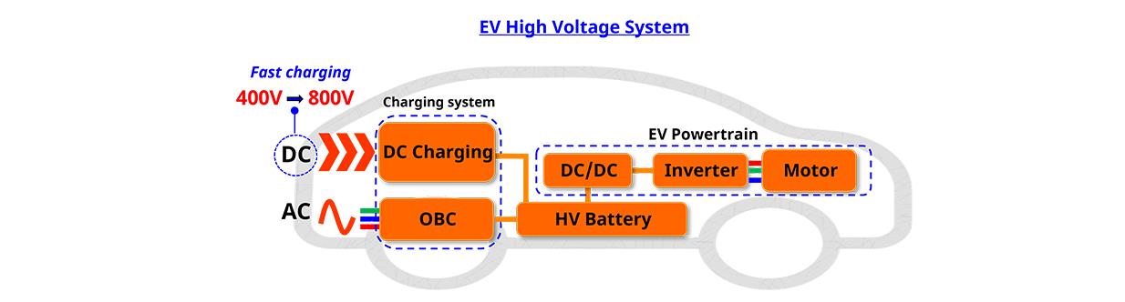 電動汽車Powertrain的基本構(gòu)成為儲存能源的高電壓電池、逆變器和電動馬達(dá)。電動汽車Powertrain使用高電壓。與電動汽車耗電效率相關(guān)的部分是高效的電力轉(zhuǎn)換。電動汽車中有LDC、OBC、Inverter等多種電力轉(zhuǎn)換裝置。采用多種DC/DC Converter Topology,可實現(xiàn)各裝置間的整合。實際上OBC(On Board Charger)和LDC(Low-Voltage DC/DC Converter)也在實現(xiàn)整合。若實現(xiàn)系統(tǒng)整合,可以減少零件數(shù)和使用空間。